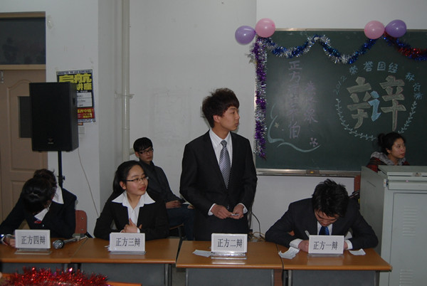 2012年3月21日晚,公司荣誉国经辩论赛决赛在1312教室隆重举行,本次活动由社团部承办,到场的嘉宾有公司党总支副书记赵钺老师,公司团委书记韩永慧老师,07级团委副书记社团部部长张瀚文学姐,05级院员工会主席杨华鑫...