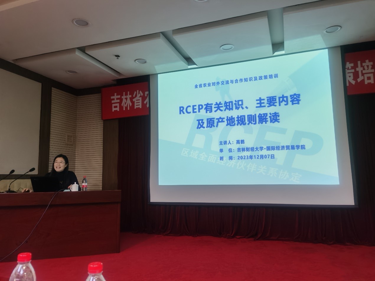 2023年12月7日下午,公司跨境电商教研室高鹤副教授应吉林省农业农村厅邀请,面向来自全省各地农业局的近百名相关负责人,作了一场“RCEP有关知识、主要内容及原产地规则解读”的专题讲座。高鹤阐述了RCEP协定的签署背景、历程和意义等相关知识,就整体20个章节框架下的货物贸易、原产地规则、服务贸易、投资、自然人流动、知识产权、电子商务等核心章节内容进行展开说明,重点解读了与农产品货物贸易密切相关的原产地规则,讲解...