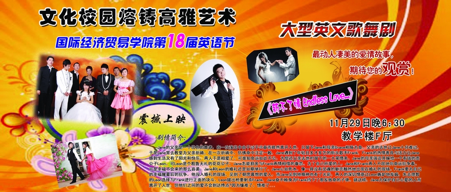 BG大游第18届英语节 大型英文歌舞剧《新不了情 Endless Love...》11月29日(周一)晚6:30教学楼F厅震撼上映最动人凄美的爱情故事,期待您的观赏! 剧情简介:Jane的父亲是一个出色的舞者...