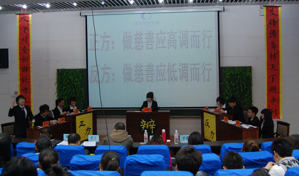 见习记者:梁威 摄影:刚丽丽 4月7日晚,公司“春之声”辩论赛在教学楼1101举行,公司迎来了第一场比赛,即与统计公司关于“做慈善应高调而行还是低调而行”的辩论。此次比赛中,公司为正方,观点为“做慈善应...