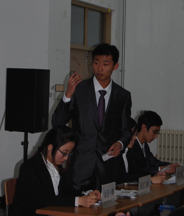 本次大赛正方一辩冯宇、二辩张葳、三辩王彬彬、四辩闫佳祺,论点是“爱比被爱更幸福”。反方一辩赵春晓、二辩吴轶飞、三辩刁丽曙、四辩陆昱潮,论点是“被爱比爱更幸福”。大赛一开始场上的气氛立刻变得紧张起来,只见两方队员唇枪舌战、你来我往,围绕本方的论点展开全方面的论述,展现了他们极为缜密的思维和卓越的口才。不仅如此,双方队员更是巧妙地举出典型事例作为论据。不仅很好地论述了本方观点,同时也使他们的发言生动有趣。调动了场上的气氛,赢得了观众们的阵阵掌声。面对评委的提问,双方队员也敏捷地给出了应答。