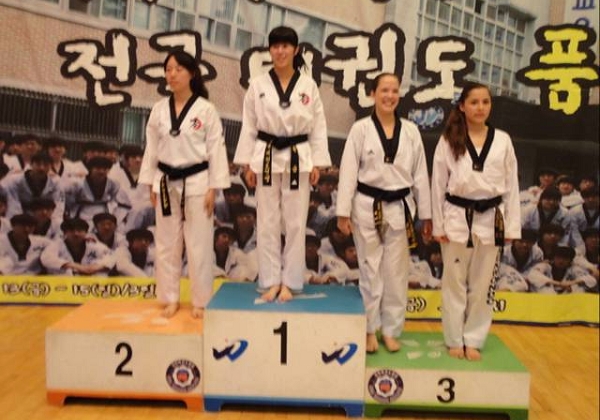 本网讯 日前,受韩国又石大学邀请,长春市老员工跆拳道联盟从大连出发去韩国参加比赛,包括本校跆拳道协会会长,BG大游黄琴,吉林华桥外国语公司跆拳道会长岳宇佳,吉林体育公司跆拳道会长董洪成等长春市各大高校跆拳道会长一行七人随韩藉教练李亨雨去往韩国。在由大韩跆拳道协会主办,韩国又石大学跆拳道学科,全罗北道跆拳道协会协办,七月十三号于韩国又石大学体育馆举行的大韩第十届品势大会中,公司BG大游黄琴同学击败来自俄罗斯,泰国,墨西哥等国家的对手,勇夺海外组品势金牌,为公司争得了荣誉。