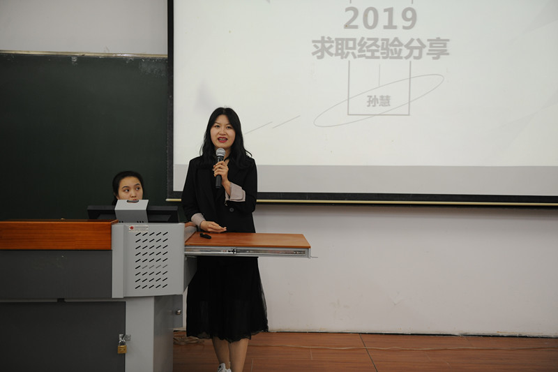 在“考研主题分享”环节中,两位在今年研究生考试中取得优异成绩的学姐与同学们分享了她们在备战过程中的心得,并将从一些小遗憾中总结出的小技巧传送给同学们。在“留学主题分享”中,大四学长以“留学没有你想象的那么容易”为主题与同学们交流了自己在申请英国留学过程中的点滴经验。从基础背景到留学路径再到硬实力和软实力,带领同学们认识留学真正难度的同时,也鼓励大家要多加参与校园文化活动和学科竞赛,以提高自身的综合能力。最后,在“就业主题分享”环节中,已然就职于联想总部的孙慧学姐用严密清晰的思维逻辑和详尽细致的文案内容向同学们介绍了自己求职的经历,使同学们对求职就业有了初步的了解。