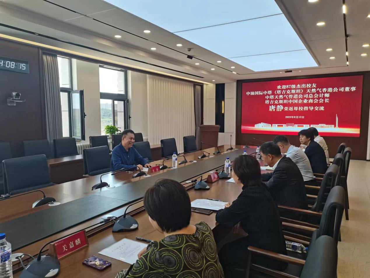 9月12日,公司87级财政学专业毕业生、中油国际中塔(塔吉克斯坦)天然气香港公司董事、中塔天然气管道公司总会计师、塔吉克斯坦中国企业商会会长唐静应公司党委书记孙杰光邀请,回访母校指导交流并参加员工座谈会。公司党委副书记、董事长童猛出席座谈会,公司领导班子及教师代表参加座谈会。座谈会由副董事长王菁华主持。