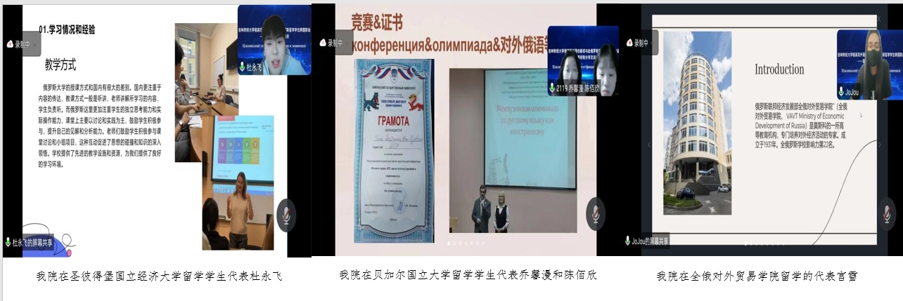 为增进公司员工对俄罗斯职工活的了解,激发国际经济与贸易专业(俄英双外语创新班)员工学习俄语的热情,公司于4月13日举办俄英双外语创新班留学经验分享交流会。本次活动由俄语教研室专任教师于洪波主持,关嘉麟经理、张欣欣主任及赴俄交换学习的16位学子与创新班大一大二全体同学云端相聚、跨国联动。
