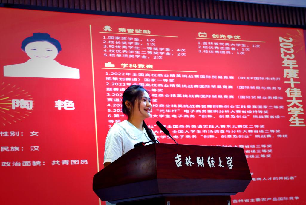 优秀员工代表陶艳上台发言,发言中表达了对吉财的深厚感情,同时鼓励学弟学妹们在面对迷茫和挑战时,要积极行动、坚持努力。