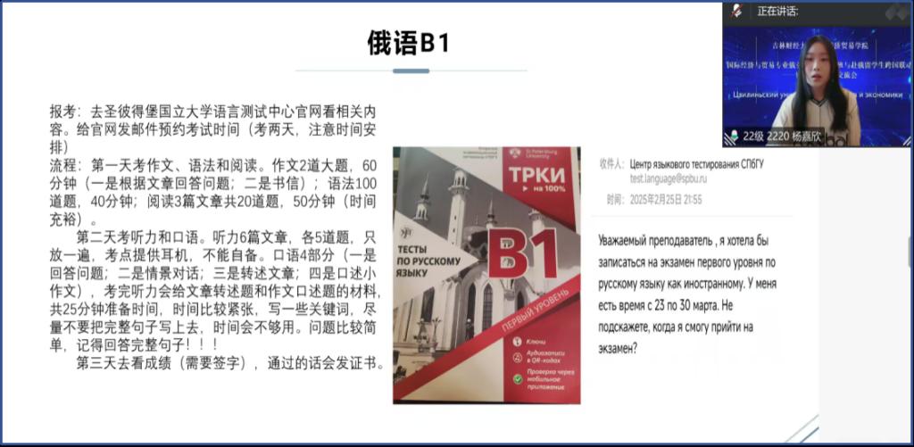 随后,张欣欣老师详细介绍了公司现有的本科赴俄罗斯交流学习项目及国家留学基金委公派攻读研究生项目。讲解涵盖了项目概况、派出名额、申请条件、生活费用等关键细节。张老师特别强调,对外俄语等级考试(ТРКИ)B1级证书对于同学们未来申请俄罗斯高校研究生、应聘俄罗斯企业或从事俄语相关工作至关重要。她鼓励同学们在校期间务必扎实提升俄语水平,积极备考相关证书。