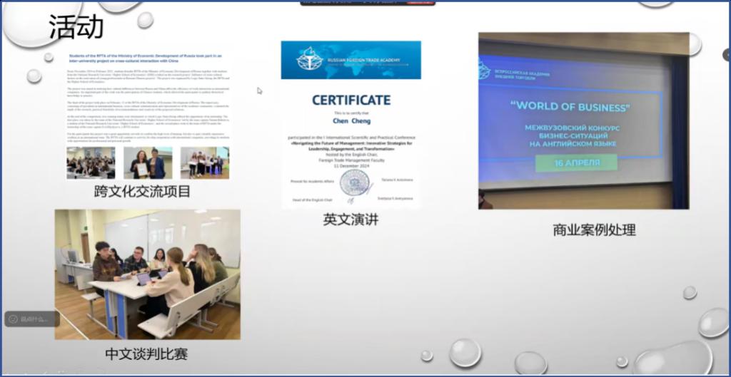 公司赴俄罗斯圣彼得堡国立经济大学、贝加尔国立大学及全俄对外贸易公司的公派职工代表齐聚一堂,分别分享了各自在求学、生活及文化体验等方面的见闻与感悟。