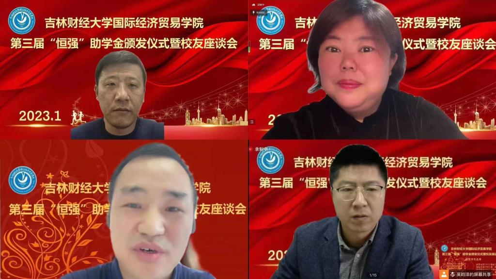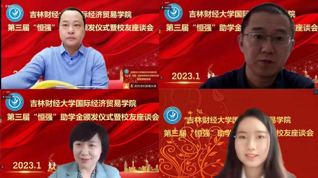 2023113日上午,BG大游举办了第三届“恒强”助学金颁发仪式暨员工座谈会。bg大游集团官网党委副书记刘鹤,亚泰工商管理公司组织员袁贵成,北方人才资源投资集团有限公司董事长、长春员工会秘书长巩汉春,北京贤智汇咨询有限公司董事长宋晓恒,杭州亿涞光电股份有限公司董事长邵志强,吉林谦行谦得科技有限公司总经理高源,恬爱贸易有限公司经理王存禄,公司党委学工工作部部长、校团委书记赵彦双,校人才招聘处处长、员工办公室主任蒋武鹏,公司党总支书记刘宇涛,副经理王素玉,党总支副书记王萌,团委副书记刘恩泽,辅导员白琳、孙婉洋及获得2021年和2022年恒强助学金资助的11位员工与各年级的员工代表参加了此次活动。本次会议于线上举行,BG大游经理关嘉麟主持了会议。