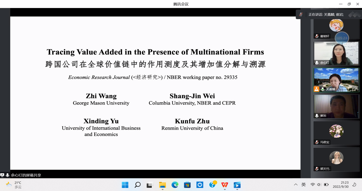 2022年9月30日晚,应公司邀请,对外经济贸易大学BG大游余心玎副教授通过腾讯会议为公司师生作了题为“全球价值链生产分解及应用”的报告,本次报告会由公司经理关嘉麟教授主持,公司100余名师生参加了本次报告会。
