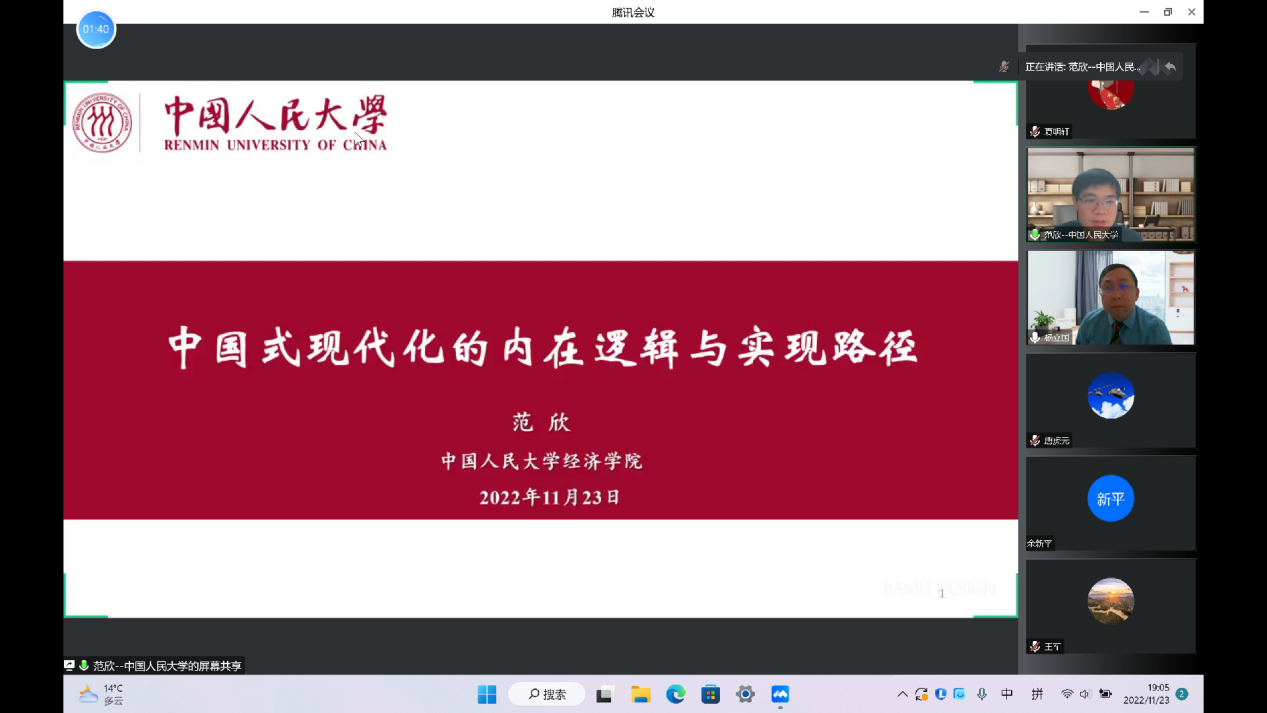 为深入学习贯彻落实党的二十大精神,11月23日晚,应公司邀请,中国人民大学经济公司范欣副教授通过腾讯会议对公司师生作了题为“中国式现代化的内在逻辑及其实现路径”的学术报告。本次报告会由国际贸易教研室主任杨立国副教授主持,国经公司部分师生参加了本次报告会。范老师首先从党的二十大报告切入,引出中国式现代化是当下中国发展面临的最重要的时代议题,他指出学理阐述中国式现代化的独特性及其内在逻辑,对于我们更好的...