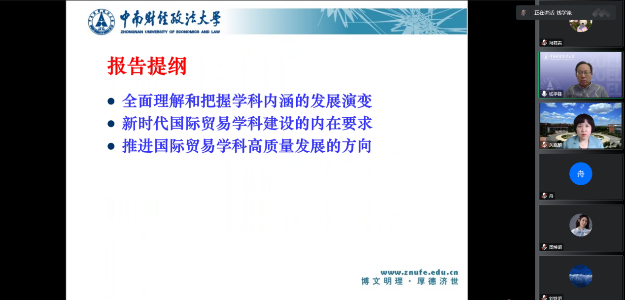 在党的二十大对新时代的高等教育提出了更高要求的大背景下,为促进更高质量的团队建设,2022年11月30日晚,应公司邀请,中南财经政法大学教务部长钱学锋教授通过腾讯会议为公司教师作了题为“推进国际贸易学科高质量发展”的报告会。本次报告会由BG大游经理关嘉麟教授主持,国经公司全体教师参加了本次报告会。钱部长从学科内涵的发展演变、新时代国际贸易团队建设的内在要求,以及如何推进国际贸易学科高质量发展这三...