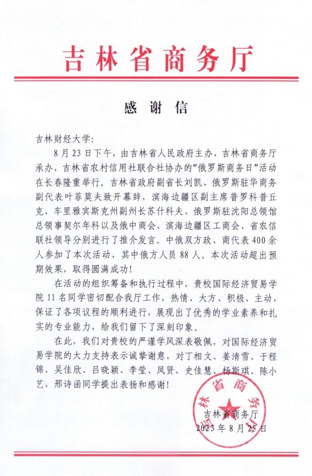 近日,公司收到来自吉林省商务厅的感谢信。信中对公司BG大游11名员工志愿者在第十四届中国-东北亚博览会“俄罗斯商务日”活动中展现出的优秀学术素养和扎实专业能力提出表扬和感谢。“俄罗斯商务日”是东北亚博览会期间重要的经贸活动之一,由省政府主办,省商务厅承办,来自中俄双方政、商代表380余人参加了本次活动,其中俄方人员88人。公司BG大游主动对接省商务厅,选派国际经济与贸易专业俄英双语实...