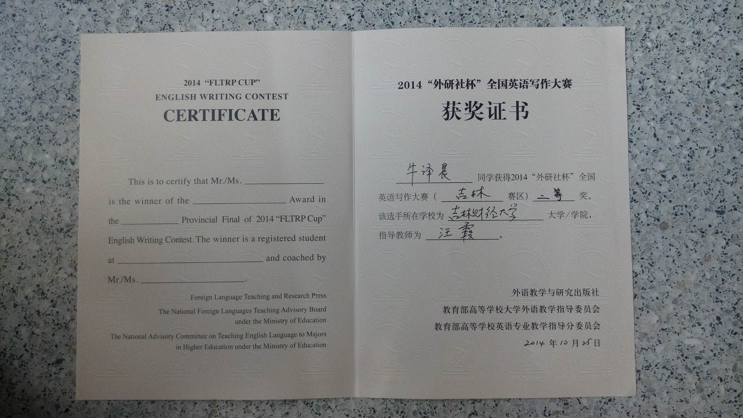 公司国贸双语专业1306班牛译晨在由外语教学与研究出版社、教育部高等公司大学外语指导委员会、教育部高等公司英语专业教学指导分委员会联合举办的2014“外研社杯”全国英语写作大赛中荣获吉林赛区二等奖。